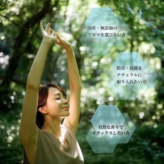 ・アロマポットやアロマディフューザーに使用することで、ご家庭でお気軽に森林浴セラピーが楽しめます。
